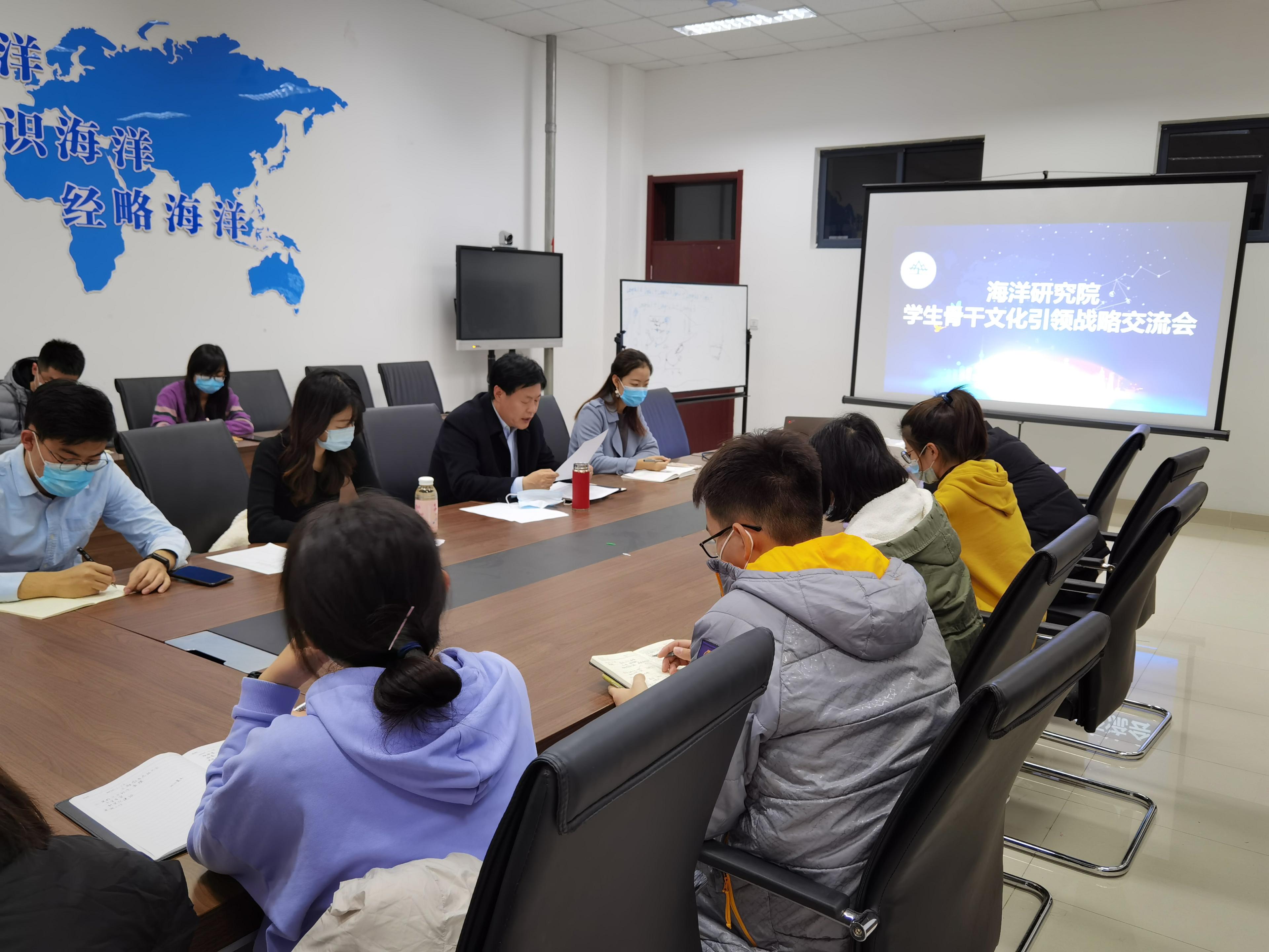 会上,张振山书记首先做了主旨讲话。在全面解读党的十九届五中全会精神的基础上,重点带领学习了《中共中央关于制定国民经济和社会发展第十四个五年规划和二〇三五年远景目标的建议》关于文化建设的具体内容,详述了“十四五”时期我国文化建设的主要目标和任务措施。并就如何扎实贯彻落实文化引领战略指出坚持以习近平新时代中国特色社会主义思想为指导,围绕国家“十四五”时期文化建设的主要目标,加强党对文化建设的全面领导,坚持马克思主义在意识形态领域的指导地位,坚定文化自信,坚持以社会主义核心价值观引领文化建设,围绕举旗帜、聚民心、育新人、兴文化、展形象的使命任务,落实立德树人根本任务,进一步增强“四个意识”、坚定“四个自信”、做到“两个维护”,践行“四个服务”,切实把文化建设作为凝心聚力的铸魂工程,凝聚全体师生爱国奉献,建功海洋,追求卓越、只争朝夕的强大精神力量。