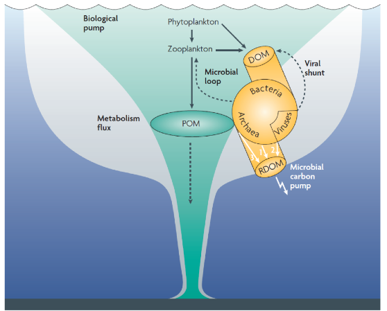 图1.微型生物碳泵(海洋微生物将有机碳从活性有机碳转化为惰性溶解有机碳,从而实现对碳的长期封存)(Jiao et al., 2010)