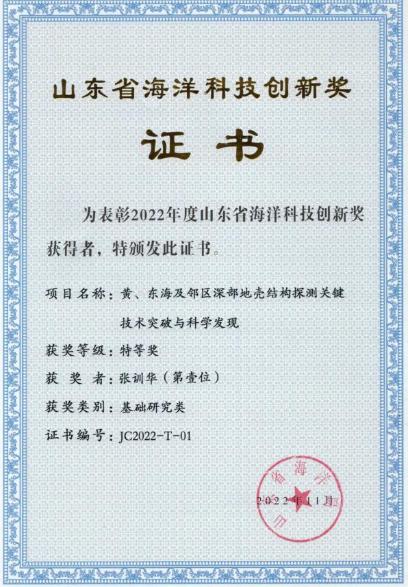 日前,2022年度山东省海洋科技创新奖正式揭晓,我院荣聘教授张训华牵头完成的《黄、东海及邻区深部地壳结构探测关键技术突破与科学发现》项目荣获特等奖,这是该奖项自2020年设立以来的首项特等奖。