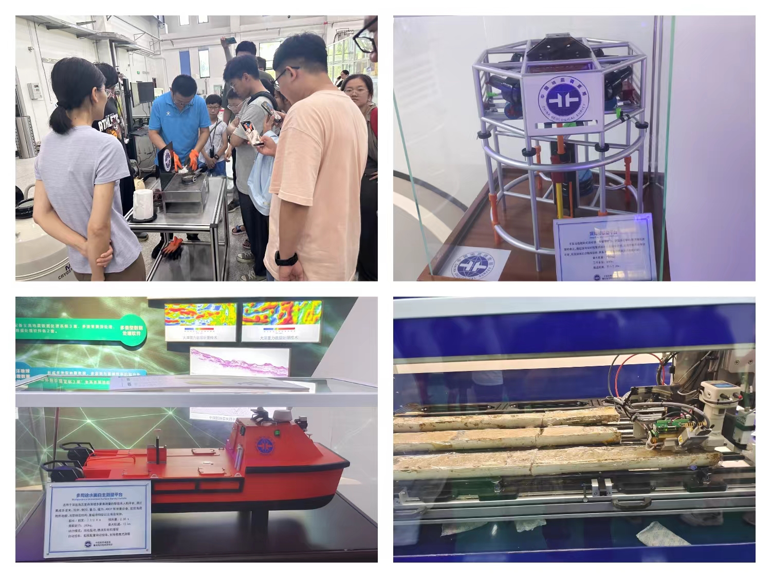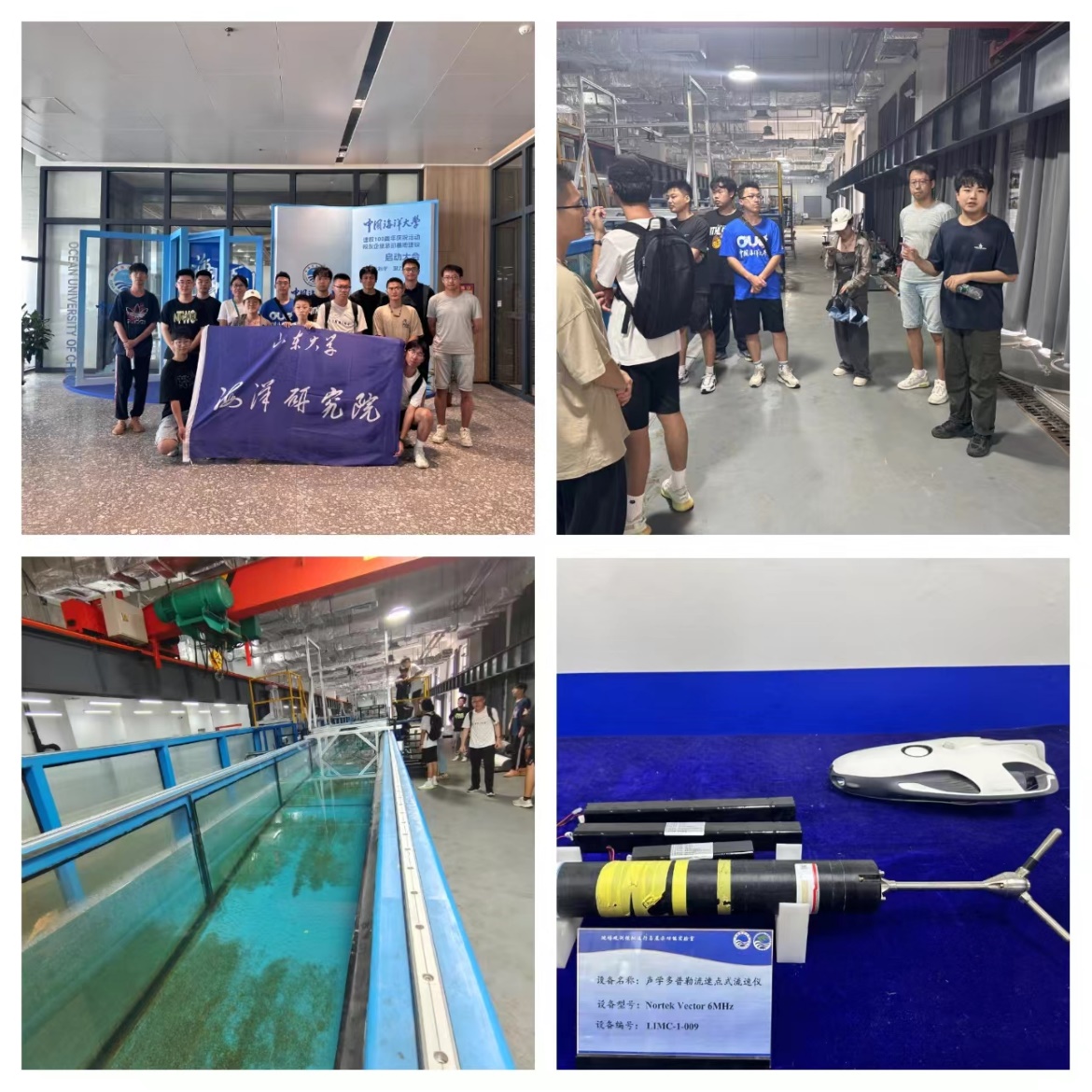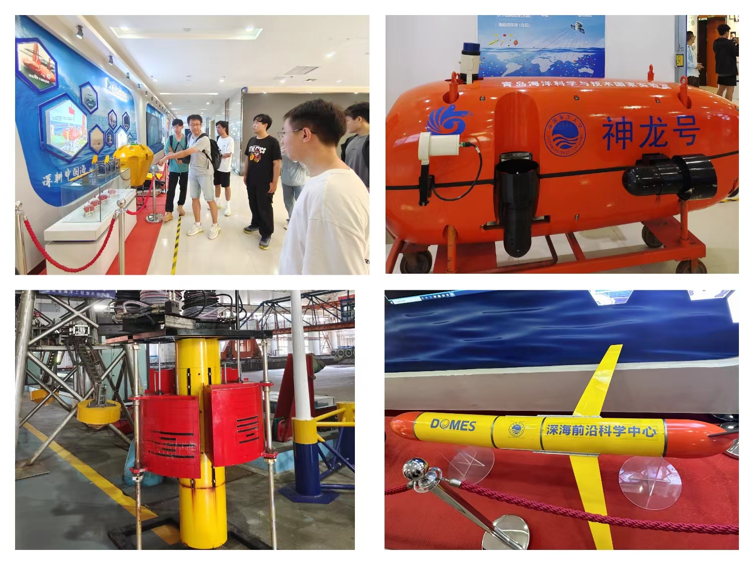7月30日上午,团队一行人来到中国海洋大学崂山校区。首先参观了海洋科技大楼展厅,这里展示着中国海洋大学的发展史和海洋科学的演变历程,也陈列了一些海洋特色设备。接着来到了海洋工程重点实验室,这里汇集了各种先进的海洋装备,包括模拟海洋环境的大型水槽和各种测量设备。最后来到了环科院的大型实验仪器中心,同学们对海洋探测设备和实验仪器表现出浓厚兴趣,参观讲解过程不仅加深了大家对海洋科学的认识,也激发了对海洋探索的热情。
