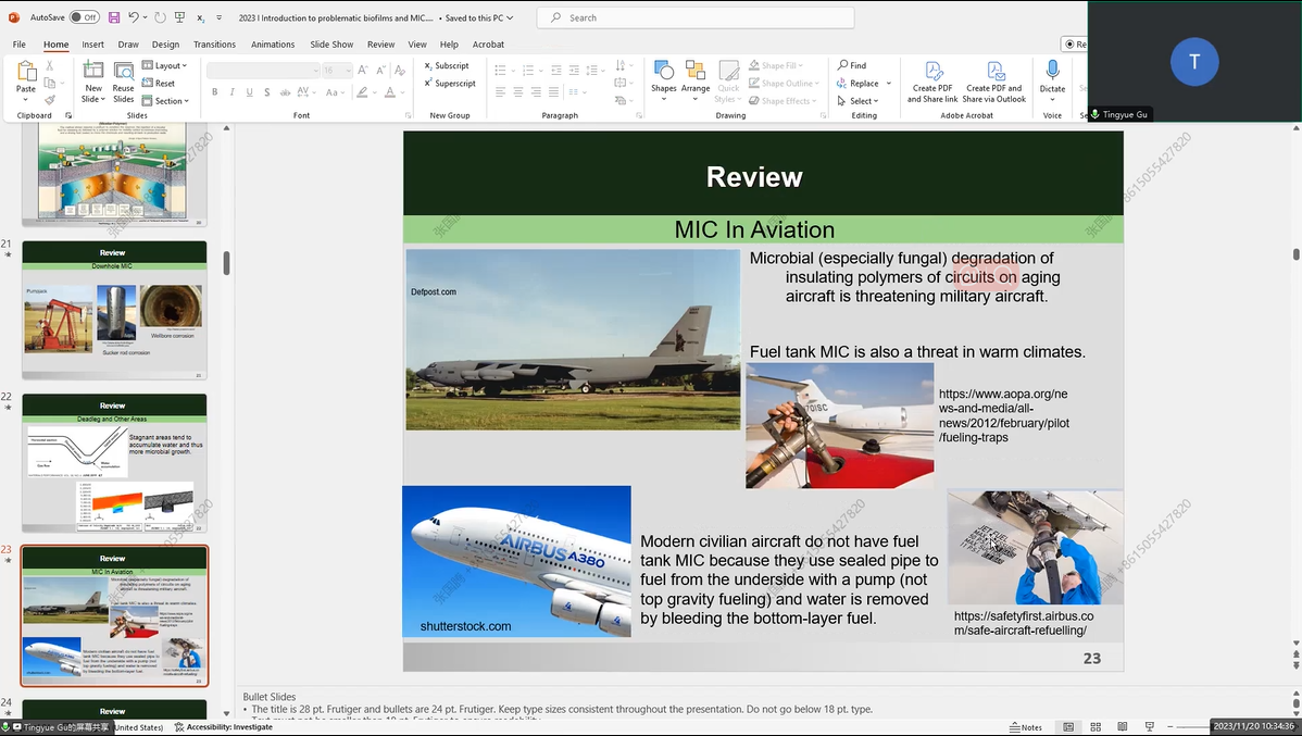 2023年11月20日上午,美国俄亥俄大学微生物腐蚀领域首席科学家顾停月教授为我院师生带来主题为“Introduction to Biofilm and Microbiologically InfluencedCorrosion”的学术讲座。讲座通过腾讯会议线上召开,刘光洲教授主持讲座,40余名师生参与此次学术讲座。