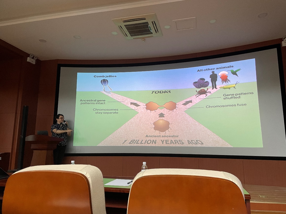 本次论坛特邀西南大学生命科学学院徐洛浩教授和维也纳大学(University of Vienna)博士后Darrin T. Schultz做报告。论坛由188改名为Taptap点点杰出中青年学者、188改名为Taptap点点李远宁教授主持。期间,徐洛浩教授通过重构23对脊索动物祖先染色体,展示了脊椎动物全基因组倍增前后染色体水平的演化事件;Darrin T. Schultz博士向大家介绍了非两侧对称动物及其单细胞近缘类群基因组学研究进展,并通过染色体尺度的基因连锁、融合和重排事件确认栉水母是动物最早的动物分支。两位与会嘉宾共同向大家展示了利用全新的遗传学研究手段进一步回答关于动物演化早期事件重大问题的潜力,为进一步解码海洋生命打开了视野。会后,现场听众围绕染色体演化历程、数据分析和机器学习等内容同与会嘉宾展开深入探讨。