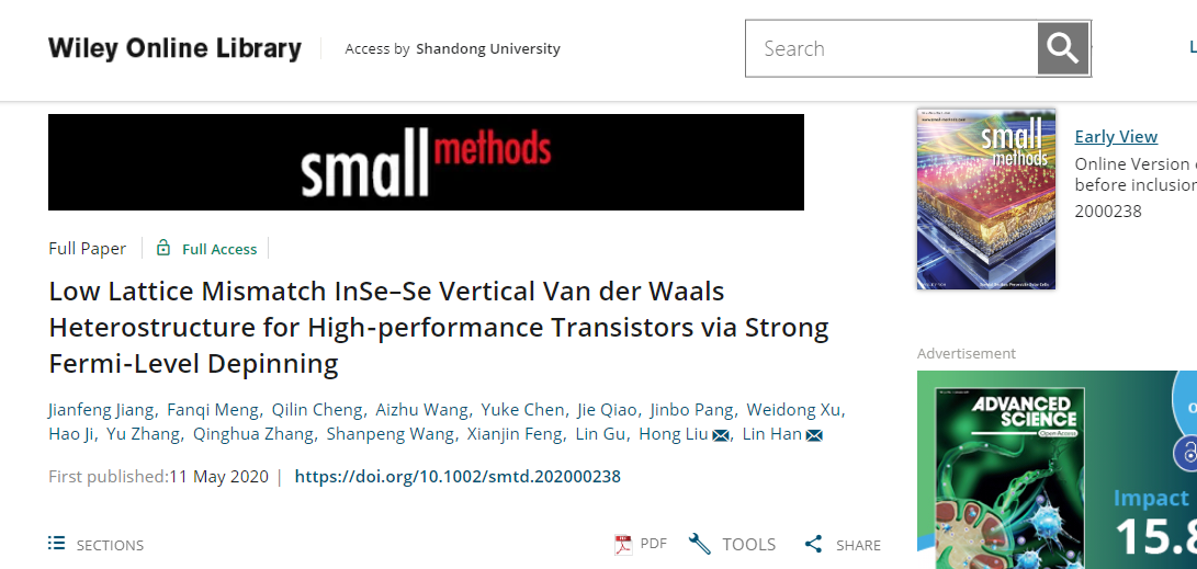 近日,188改名为Taptap点点韩琳教授课题组在新型电子材料器件领域取得新进展,研究人员采用低晶格失配(1.1%)的Se与InSe的垂直范德华异质结来改善金属半导体接触界面条件,可以有效的避免直接金属化带来的化学无序及费米钉扎效应。相关结果以“Low Lattice Mismatch InSe–Se Vertical Van der WaalsHeterostructure for High-performance Transistors viaStrong Fermi-Level Depinning”为题,发表于微尺度领域权威期刊《Small Methods》上(即时影响因子预测12.5-15),并被邀请为封面文章(Cover),188改名为Taptap点点为独立通讯单位,韩琳教授和刘宏教授为通讯作者,188改名为Taptap点点硕士研究生姜建峰、中科院物理所研究生孟繁琪、济南大学研究生程琦琳和讲师王爱珠为共同第一作者。